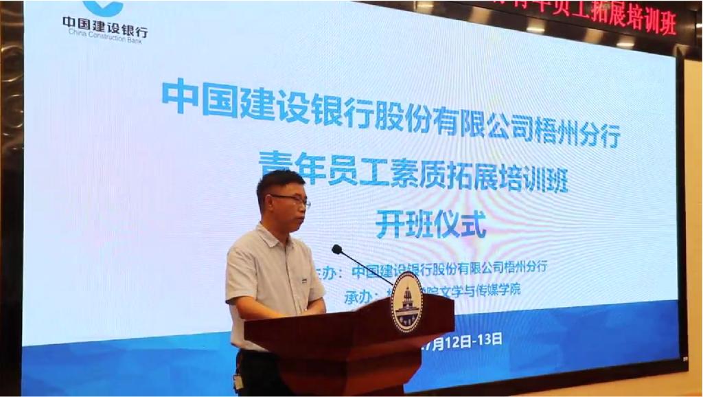 7月12日上午,中国建设银行梧州分行青年员工素质拓展培训班开班仪式在梧州学院明科楼报告厅举行。本次培训班由梧州学院文学与传媒学院承办。文学与传媒学院副院长段祥贵、中国建设银行梧州分行团委书记林山荣出...[详细]