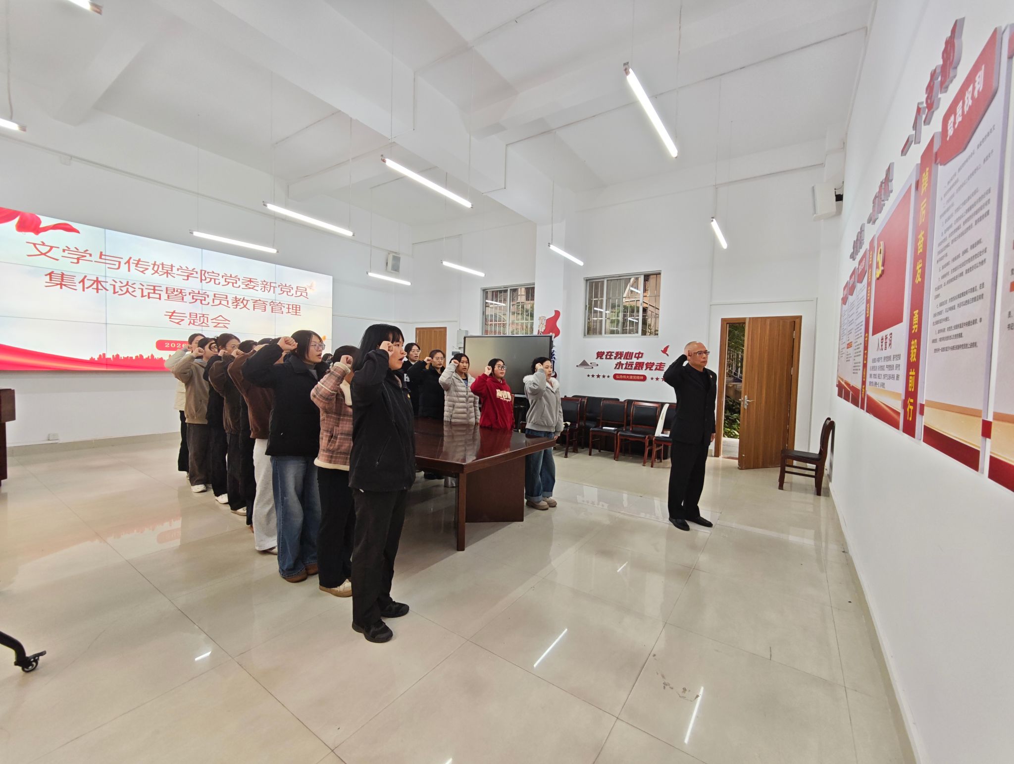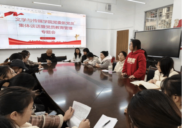 2026年1月12日,文学与传媒学院党委于明理楼南楼一楼学院党员活动室组织召开新党员集体谈话暨党员教育管理专题会。学院党委书记梁宏云、学生第二党支部书记黄金梅及新发展的预备党员参加会议。
