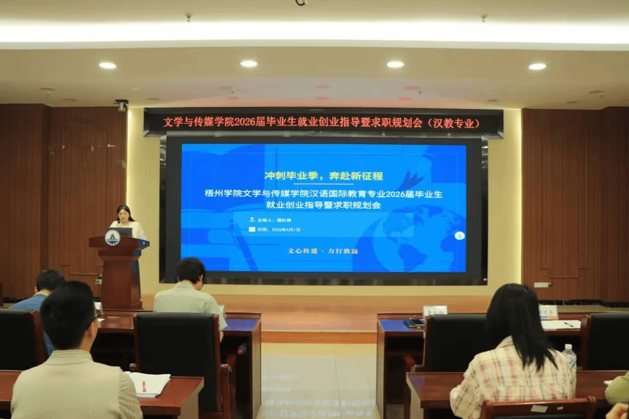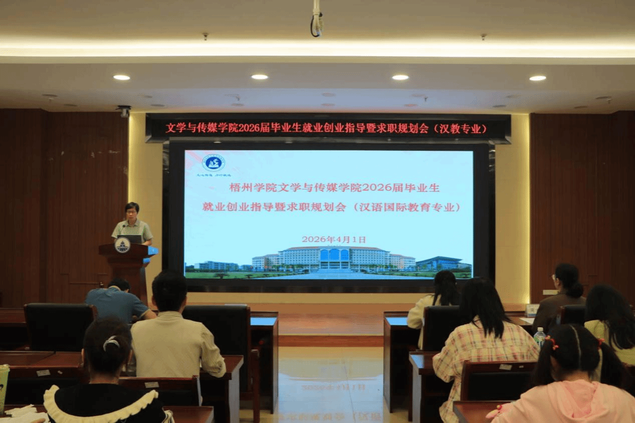 4月1日晚,文学与传媒学院于明科楼一楼学术报告召开了2026届汉语国际教育专业毕业生就业创业指导暨求职规划会,学院党委副书记龚红梅、副院长谢友中、汉教专业教师、毕业班班主任、辅导员和2026届汉语国际教育专业毕业生参加。