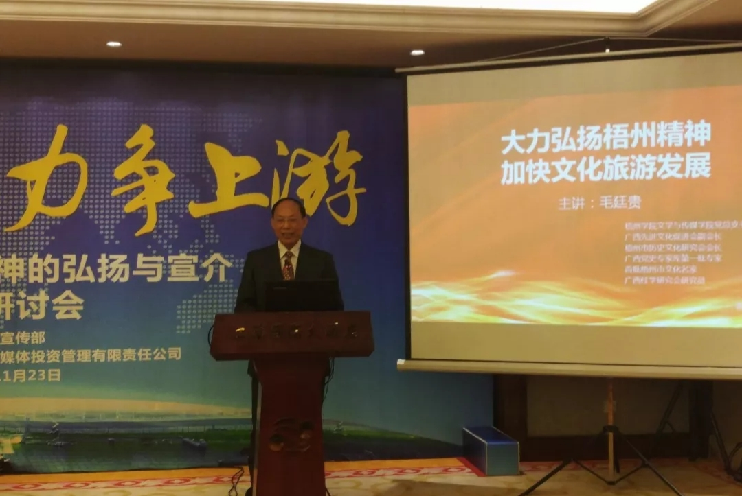 毛廷贵作了《大力弘扬梧州精神 加快文化旅游发展》的发言。毛书记认为,“海纳百川、力争上游”明确了梧州精神是“开放、包容、进取、创新”的精神,不仅具有历史的承继性,而且还有与时俱进、奋勇前行的时代特征,具有强大的号召力和凝聚力。 在怎样去弘扬新时代梧州精神加快发展梧州文化旅游的话题上,毛书记提出,最为重要的首先还是要解放思想,过去在文化旅游方面不敢想不敢做,导致文化旅游亮点不多,文化旅游产业没有走上一条良性发展的康庄大道,我们要多问几次为什么梧州文化旅游发展这么慢?为什么百色打造红色旅游跑到我们前面去了? 一是打开思路想办法,聚智聚力谋梧州文化旅游发展,已是刻不容缓。二是要坚定不移“东融”,打开客源市场。三是要多宣传我们的历史文化品牌,“酒香不怕巷子深”那是过去式,现在“互联网+”的时代,必须要利用一切媒体手段加强宣传,要让“岭南文化古都”、“ 岭南古代佛城”、“ 龙母故乡” 、“粤语发源地”等品牌深入人心。四是搞好文化旅游的项目,加强招商引资。五是要振奋精神,力争上游。