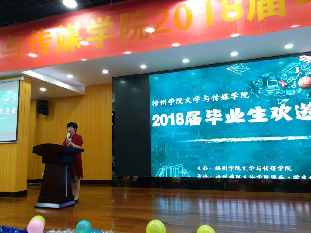 梧州学院文学与传媒学院今天下午举办2018届毕业生欢送会,活动由文传学院团委和学生会承办。文传学院院长莫敏教授对毕业生发表了热情洋溢的讲话,祝福同学们事业顺心一生康乐! 学弟学妹表演了歌曲和诗歌朗诵祝福师兄师姐们。