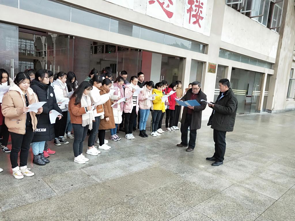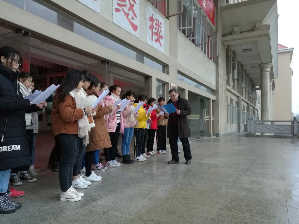 1月2日早7:20多在明理楼前,杨奔校长带领大家一起诵读《岳阳楼记》和《我和我的祖国》。参加此次诵读活动的有2018级汉语言文学一、二班诵读兴趣小组成员和喜欢诵读的小伙伴等35人和诵读兴趣小组指导老师李光先。