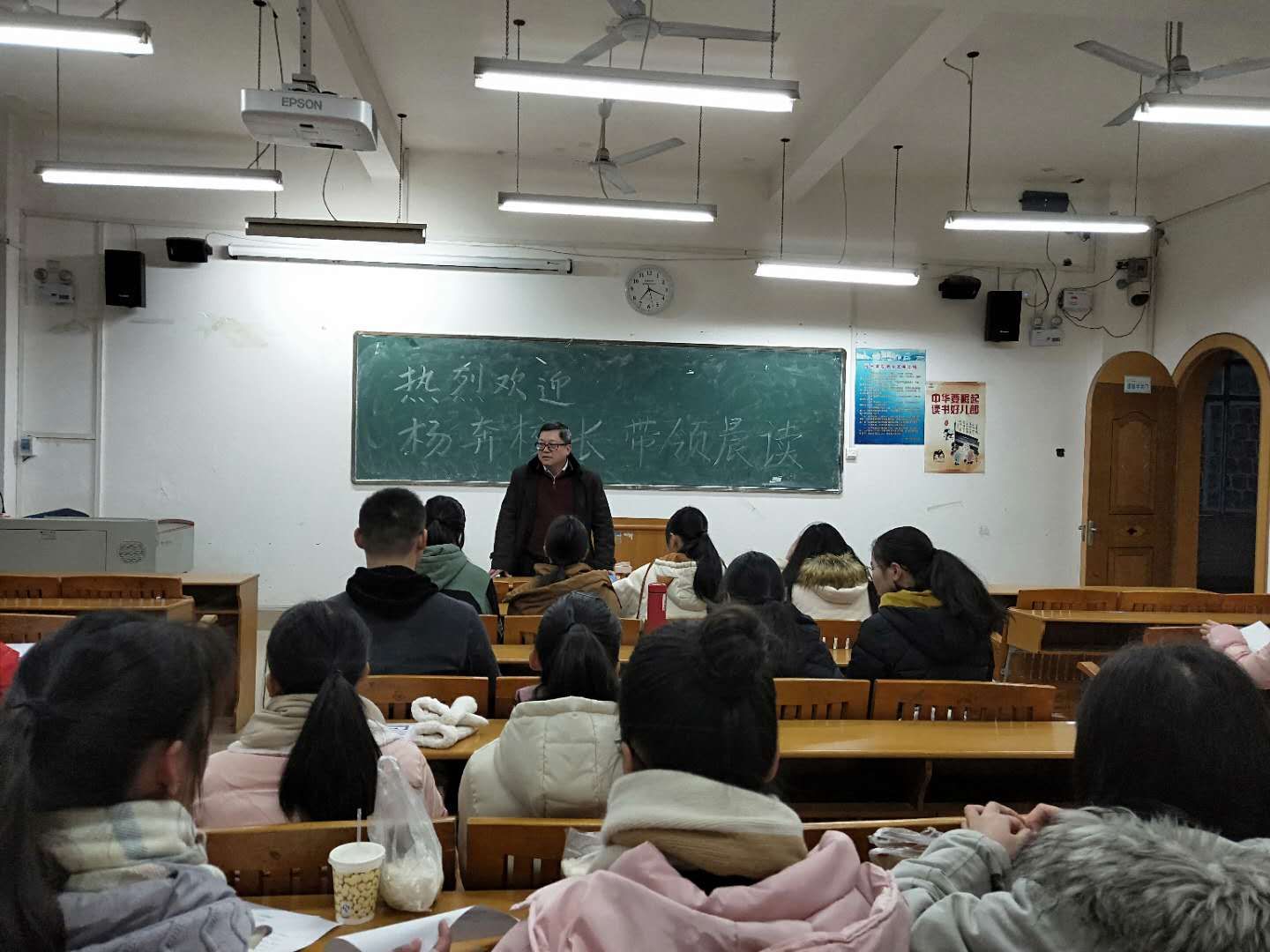杨奔校长希望通过带领汉语言文学一、二班诵读兴趣小组晨读来带动全校晨读,并在校园里形成浓郁的晨读氛围。