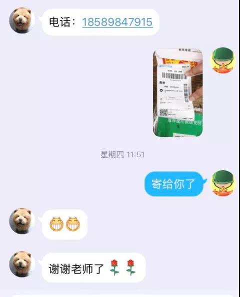 “4月15日上午10点44分,我给辅导员发了信息让他帮忙邮寄衣服、书、鞋子、相机……嘱咐他帮我种的花浇浇水,第二天中午我就收到东西了,当时心里真的是满满的感动,何老师真的太好了!”