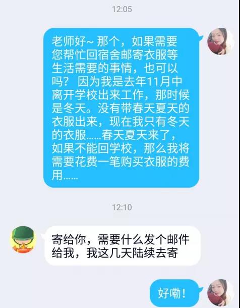 “当时我刚刚来到广东顺德实习,身上就带了一套衣服,想让何老师帮忙寄一些生活用品,过几天排上号以后他帮我寄过来了。收到快递的时候,一时用文字表达不出来的情感,就感觉特别暖心。”