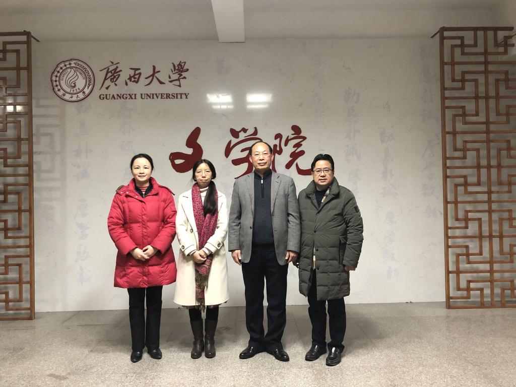 走进广西大学文学院清幽别致的一楼庭院,胡小坤书记指着墙上的《文学院历史沿革图》向毛廷贵书记和何华湘副书记介绍了西大文学院的源流变迁和文学院的家底。在胡书记的办公室,毛书记详陈了梧州学院文学与传媒学院的发展和现状,分析了两个学院在发展过程中遇到的共性问题和经验借鉴的可行性以及对口帮扶的迫切性。胡书记表示,西大文学院将不遗余力地扶助、支持梧州学院文传学院克服困难,把汉语言文学专业办出特色,搞好汉语国际教育硕士点建设。室雅人和,宾主相谈甚欢。