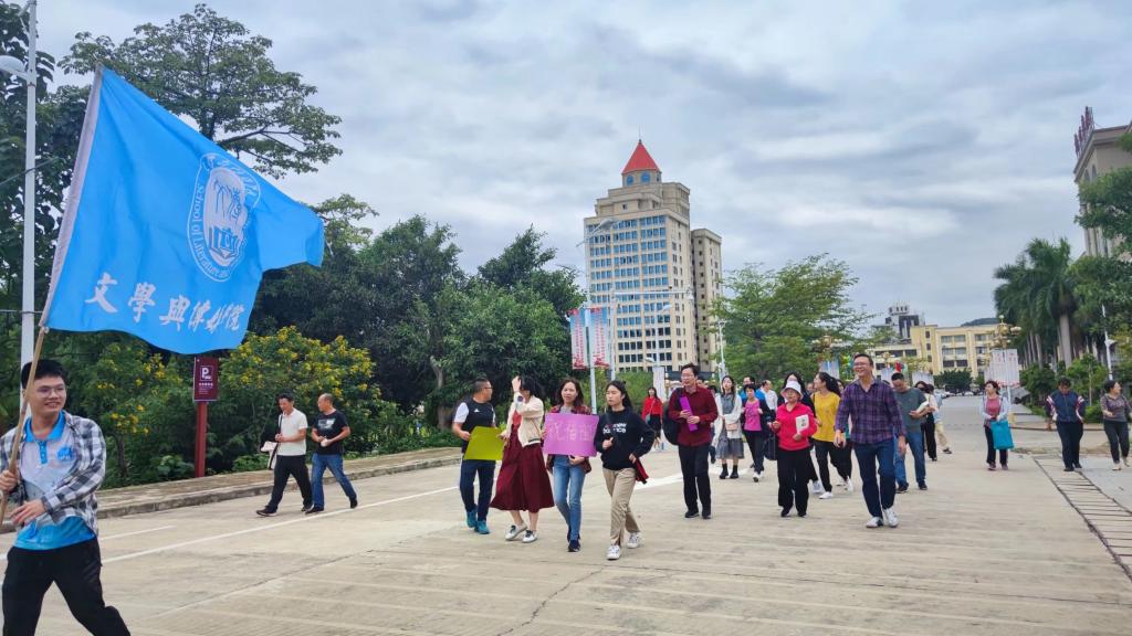 2020年10月7日下午文学与传媒学院工会举办“爱家 爱校 爱国”为主题的环校健康走活动。本次活动为非竞技性徒步健身活动,起点及终点位置设置在明理楼,行走路线为校内环道。沿环道指定位置设置有2个签到点,分别是网球中心和图书馆。教职工从明理楼出发,经2个签到点签到,写下对学校、祖国的祝福,再回到终点签到确认,领取纪念品。