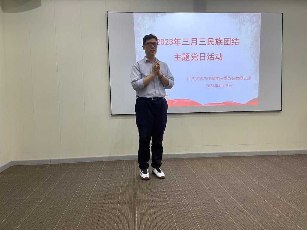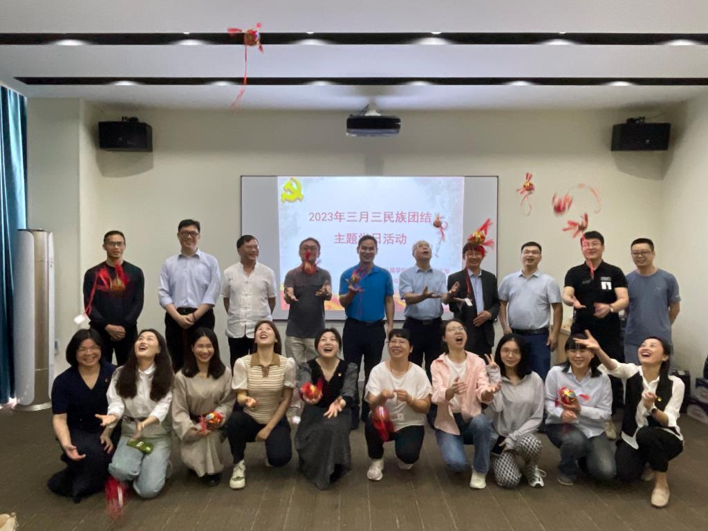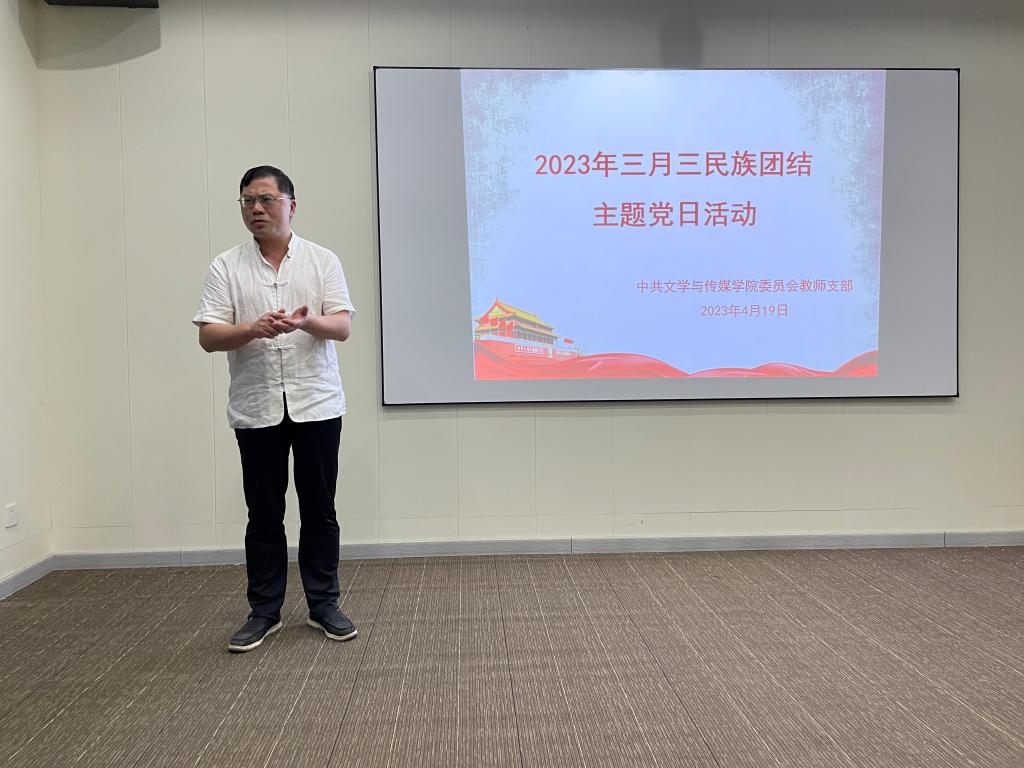 在壮族“三月三”来临之际,为深入开展民族团结教育,传承和弘扬优秀民族文化,文学与传媒学院教师党支部于4月19日下午在实验楼西座三楼融媒体实验室召开三月三民族团结主题党日活动。文学与传媒学院全体教师党员参加了活动,活动还邀请了台籍教师代表、新进教师代表参加。