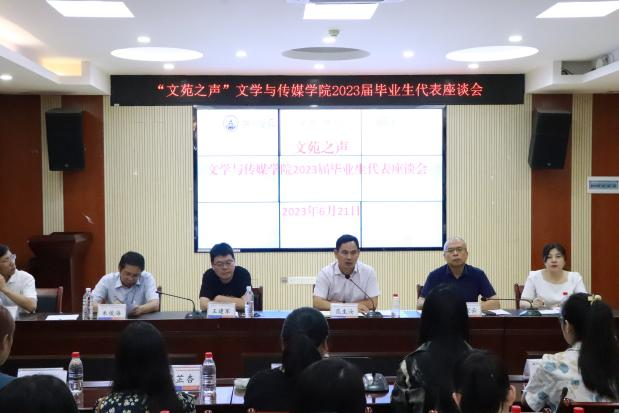 6月21日,文学与传媒学院于明理楼七楼视频会议室举行2023届毕业生座谈会。学校党委常委、副校长范生汝、文学与传媒学院党委书记梁宏云、院长王建军、党委副书记龚红梅、汉语言文学专业教研室主任张家异、新闻专业教研室主任朱俊海、毕业生辅导员周才芳以及各毕业班班主任、毕业生代表出席本次座谈会。