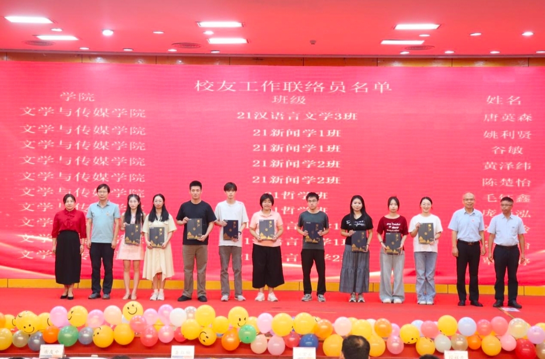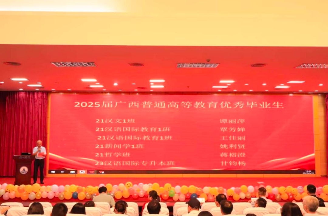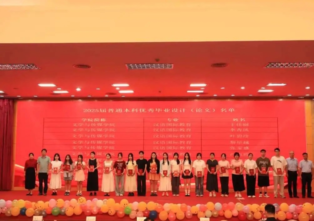 活动在温馨的毕业生祝福视频中拉开序幕。23汉文3班赵晨雯带来歌曲《凤凰花开的路口》,用歌声诉说毕业的不舍与对未来的期许;语艺团成员黄梦莹、成紫烨、韦小敬、许凤娟带来朗诵《有你的夏天》,以深情的话语带大家回顾校园美好时光。在颁奖仪式环节,学院党委书记梁宏云宣读获奖毕业生名单及获聘校友工作联络员名单,学院领导分别为获奖及获聘毕业生颁发荣誉证书及聘书,表彰他们在校期间的优异表现,希望他们发扬“文心传道 力行致远”的院训精神。教师代表谭荣鸿寄语毕业生,希望他们在未来的道路上坚守初心、勇于拼搏;优秀毕业生代表王天艺分享在校成长经历,表达对母校的感恩;校友工作联络员代表毛钰鑫表示将积极搭建校友与母校的沟通桥梁;学院副院长(主持工作)段祥贵致辞,鼓励毕业生以梦为马、不负韶华,在新征程中书写精彩人生。