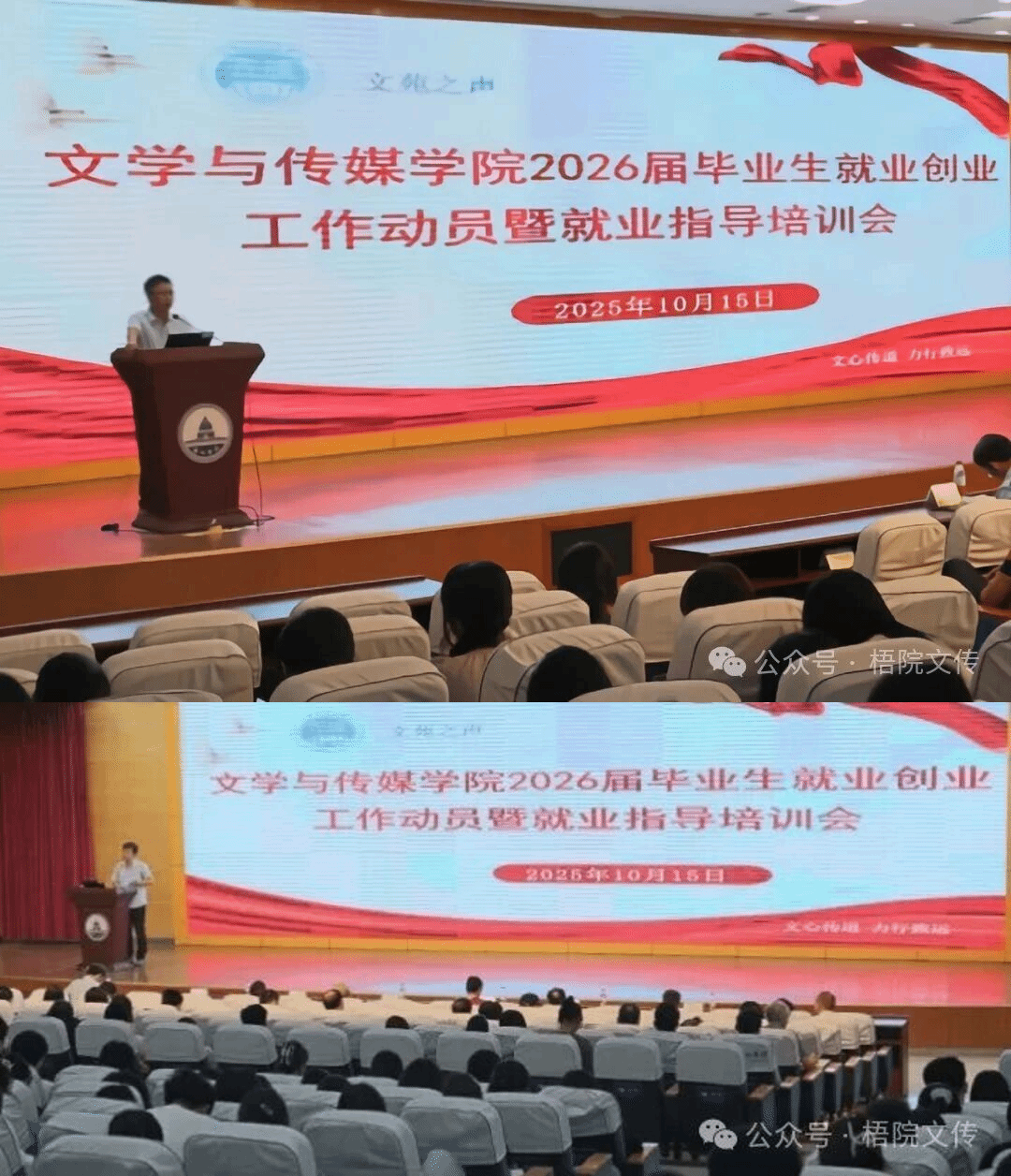 2025年10月15日下午,文学与传媒学院在明理楼一楼学术报告厅召开2026届毕业生就业创业工作动员暨就业指导培训会。学院领导班子、各专业教研室主任、2026届毕业生辅导员与班主任、学院全体教职工及2026届全体毕业生参会,会议由毕业班辅导员唐悦主持。