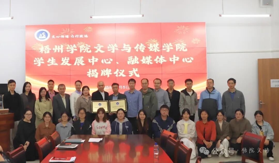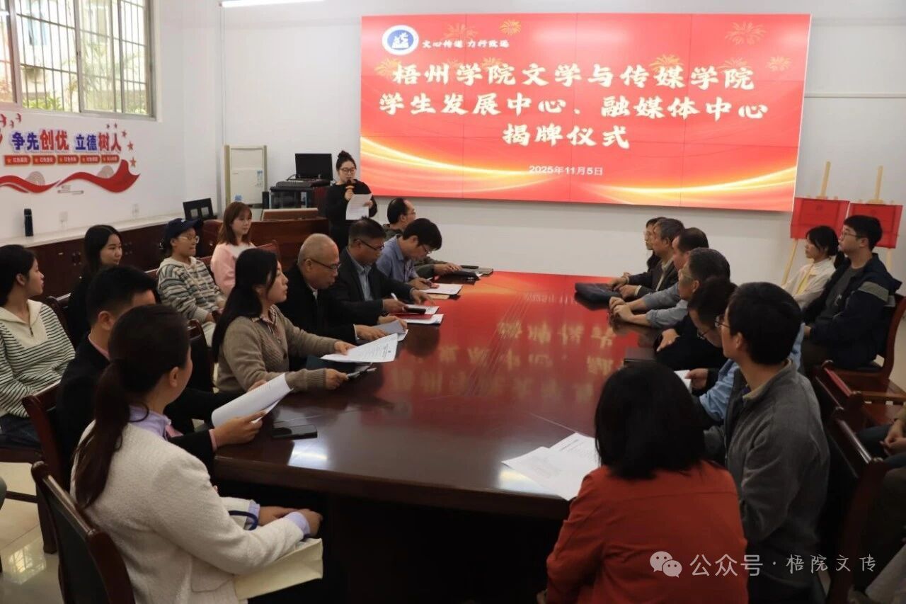 11月5日,梧州学院文学与传媒学院举行学生发展中心、融媒体中心揭牌仪式。学院党委书记梁宏云、副院长(主持工作)段祥贵、党委副书记龚红梅、副院长谢友中出席活动,各专业教研室主任、教师代表及学生代表参加活动。