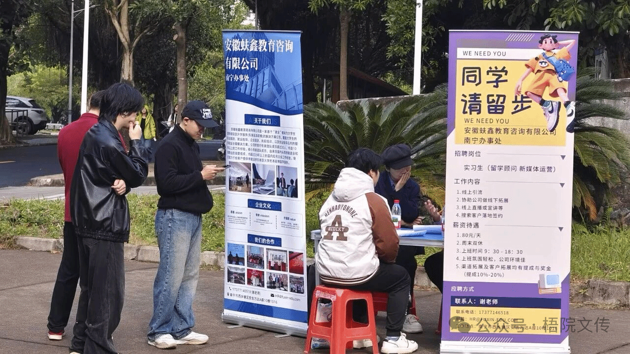 11月30日上午,梧州学院文学与传媒学院在A11楼下小广场举办2026届毕业生双选会。本次双选会邀请了安徽蚨鑫教育咨询有限公司南宁办事处、广州铁航教育科技有限公司、广西一心教育管理集团有限公司等企业来校,为毕业生带来多种应聘选择。文学与传媒学院党委副书记龚红梅到现场与用人单位、毕业生进行交流。