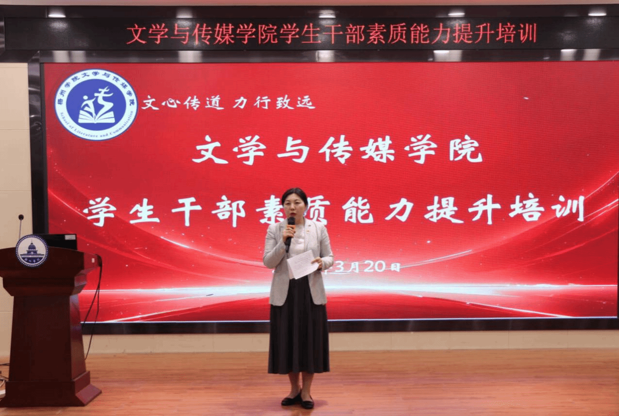 3月20日下午,文学与传媒学院学生干部素质能力提升培训在明科楼一楼报告厅举行。出席本次活动的有学院党委副书记龚红梅老师,学院分团委书记刘耀晖老师,以及我院学生会、团委、青年志愿者分会、党建中心的全体成员。