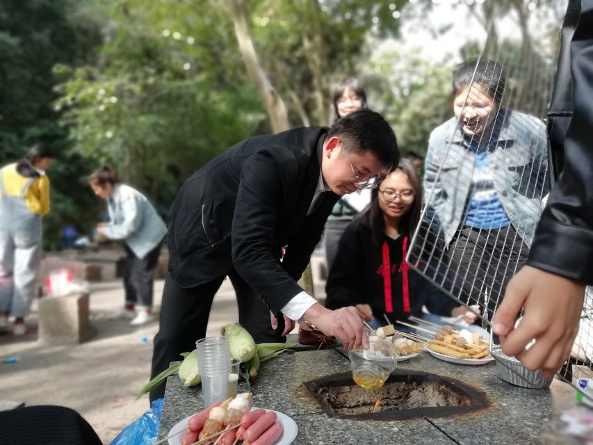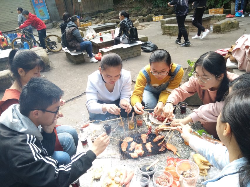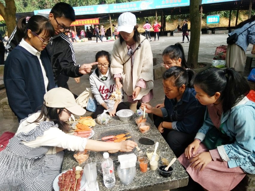 一切材料准备好之后,大家按宿舍为单位一起烧烤。而班主任和班助学姐这两个“多余”的组员则可以不时加入其他组参与活动。同学们都对烧烤表现出了很大的兴趣,都想一展身手。然而有些人手艺不佳做出的成品却不尽人意,有些同学却对此熟门熟路,因而受到全宿舍的欢迎,而有些则眼巴巴等着舍友烤好了再开心地去吃。当一些组有些食材不够时,又可以和隔壁组交换着东西继续这场美食盛宴。活动从早上9:40一直到下午3点,同学们兴趣也渐渐从对吃的转移到拍照,唱歌和看风景等一系列的活动中去了。接着大家共同拿着班旗一起拍了集体照,同学们的笑脸也定格在了这一天。最后同学们都心满意足地结束了这次班建。
