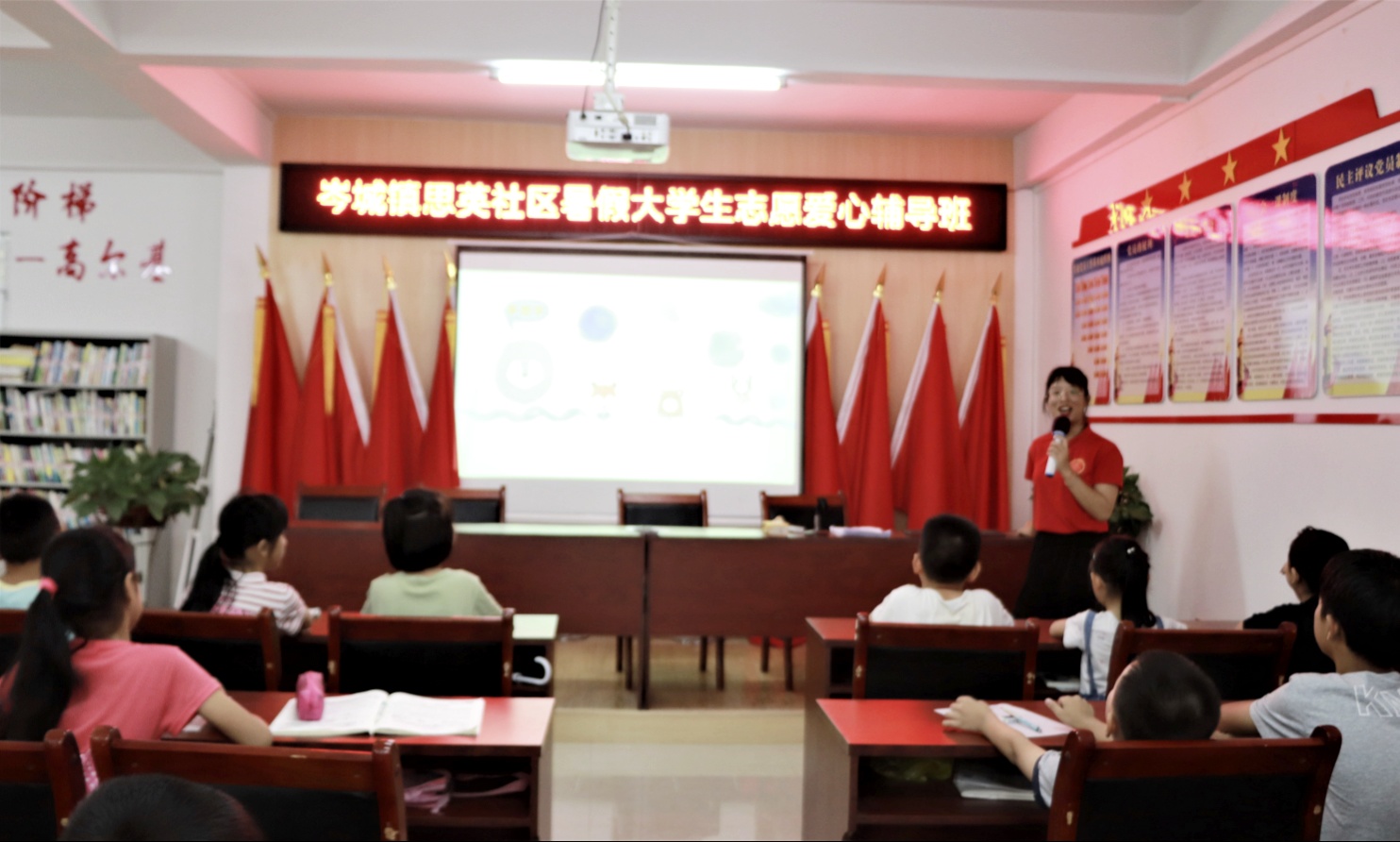 下午3:30,爱心支教活动准时在岑溪市各社区开展,老师们与文传学院志愿者们来到岑城镇思英社区。文传学院志愿者们通过学习《弟子规》小课堂、讲解妙趣横生的多音字的方式为小朋友们传授知识。课堂上,何剑老师与小朋友们亲切互动,为积极回答问题小朋友们发放糖果,教室里满是欢声笑语。