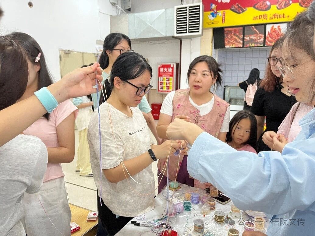 活动现场设有五大特色工坊,仿佛一幅流动的民俗画卷。在“灯彩DIY”区,同学们拿起画笔,将心中所想的团圆意象绘于灯笼之上,让这份心意随灯光点亮。而在“绳语编织屋”里,五彩丝线在指尖穿梭,将一根根细线编织成精美的团圆结,也编织起同学们间的深厚情谊。