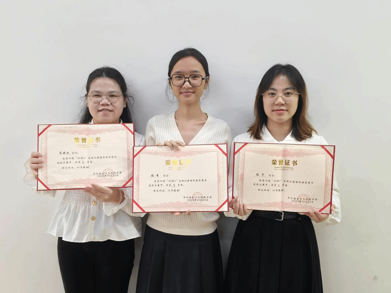 2025 年 10 月 26 日,由中外语言文化比较学会与浙江越秀外国语学院联合主办的第三届汉语国际教育国家级一流本科专业建设国际高峰论坛暨第四届 “汉语 +” 全国汉语国际教育教学技能大赛在浙江绍兴圆满落幕。我院汉语国际教育专业三名学子凭借扎实的专业功底与出色的教学实践能力,荣获本科组三等奖。