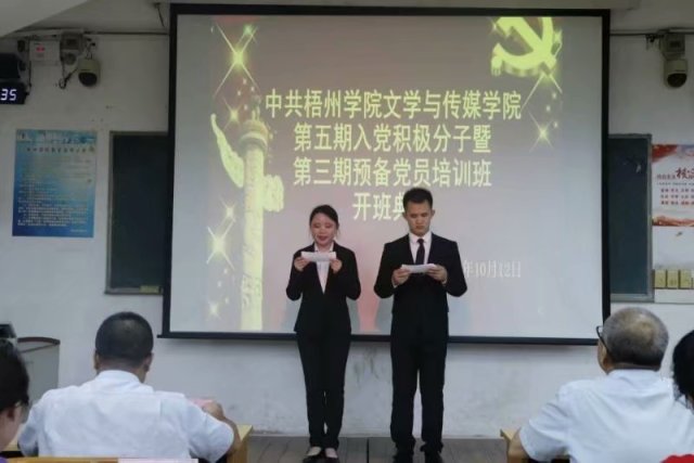 10月12日晚,文学与传媒学院第五期入党积极分子暨第三期预备党员培训班开班典礼在明理楼S603教室举行。参加此次开班典礼的有文学与传媒学院党总支书记梁宏云,党总支副书记何剑,文学与传媒学院团委书记、培训班班主任及学生第三党支部书记黄振祺,学生第一党支部书记李红梅,学生第一党支部副书记林紫珊,学生第二党支部副书记顾韦雯,学生第三党支部副书记韦炫宇,学生党建工作服务中心全体成员及全体培训班成员。